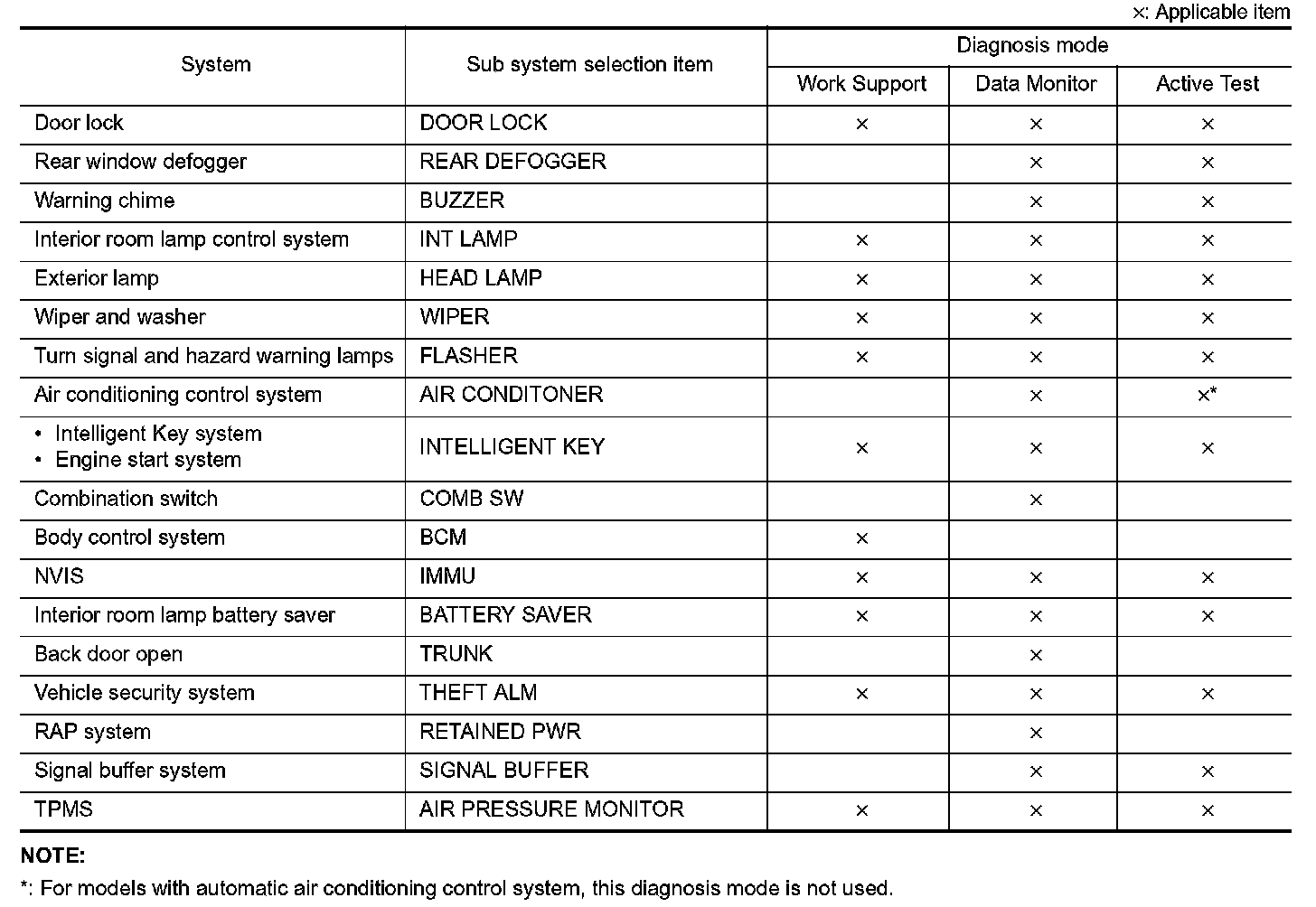 It can perform the diagnosis modes except the following for all sub system selection items.