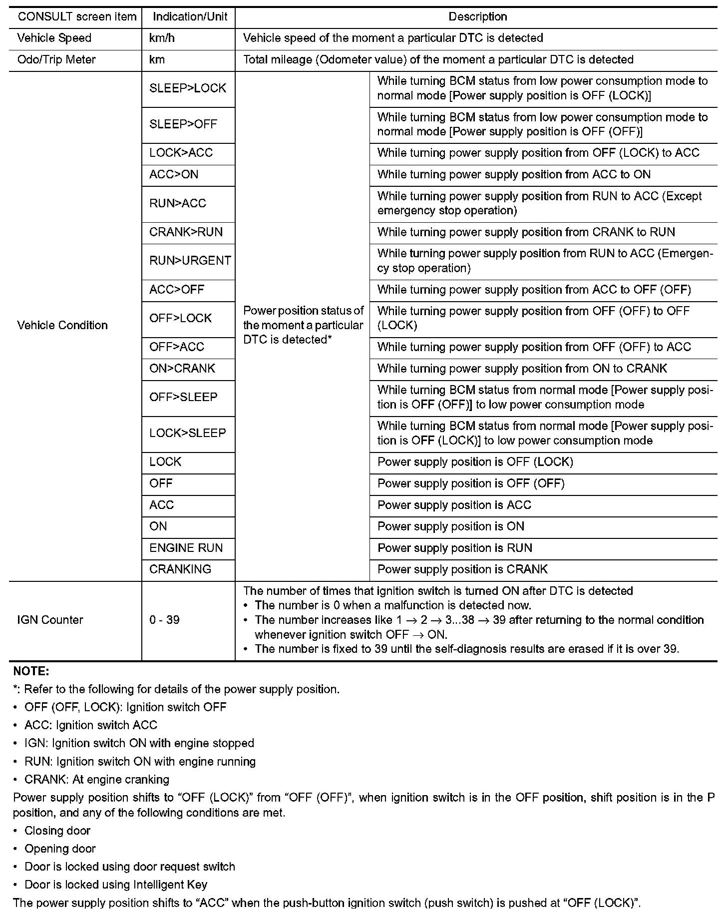The BCM records the following vehicle condition at the time a particular DTC is detected, and displays on