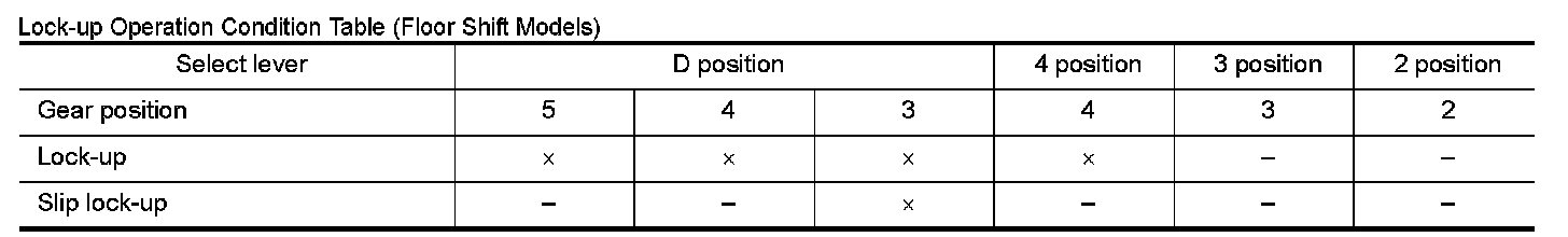 Lock-up Operation Condition Table (Floor Shift Models)