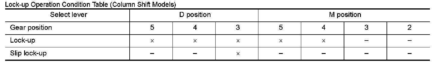 Lock-up Operation Condition Table (Column Shift Models)