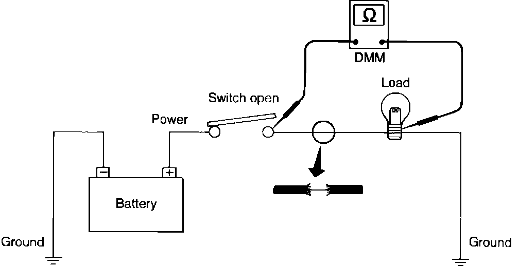 Check the wire in the illustration. If an ohmmeter is used to measure resistance (circuit off), the single strand of wire still making contact would give a reading of 0 ohms. This would normally indicate a good circuit. But when the circuit operates, the wire will not be able to carry enough current and the bulb will be dim. Using a proper Voltage Drop test will show this wire to have high resistance.