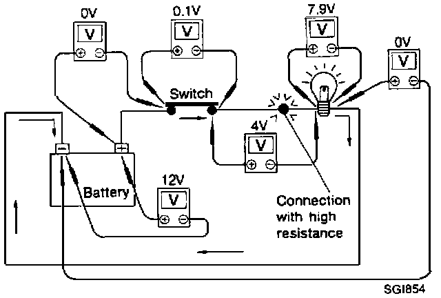 2. An unusually large voltage drop will indicate a component or wire that needs to be repaired. As you can see in the illustration above, the poor connection causes a 4 volt drop.