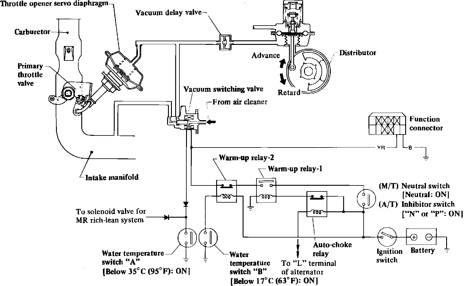 This system, Fig. 92, is used to reduce hydrocarbon emissions during cold conditions. When the manifold vacuum is introduced to the vacuum line by the vacuum switching valve, the throttle valve is opened and spark timing is retarded.