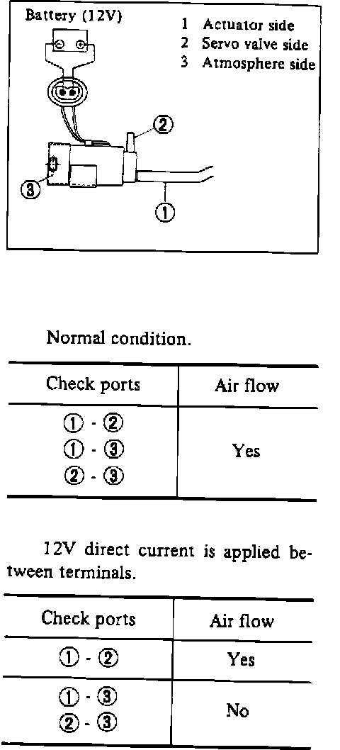 3. Apply 12V across valve terminals and check air flow through valve from actuator side as described on image chart.
