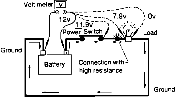 3. The voltmeter will indicate how many volts (voltage drop) are being used to "push" current through that part of the circuit. Note in the illustration that there is an excessive 4.1 volt drop between the battery and the bulb, or a 4.0 v. drop between the switch and the bulb.