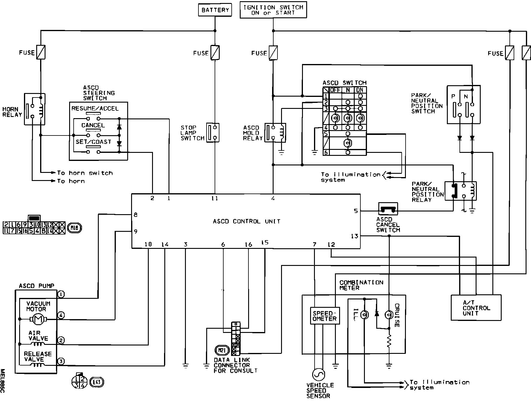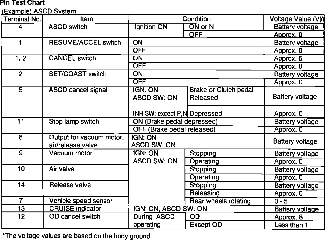 This chart indicates appropriate pin voltages for the ASCD system: