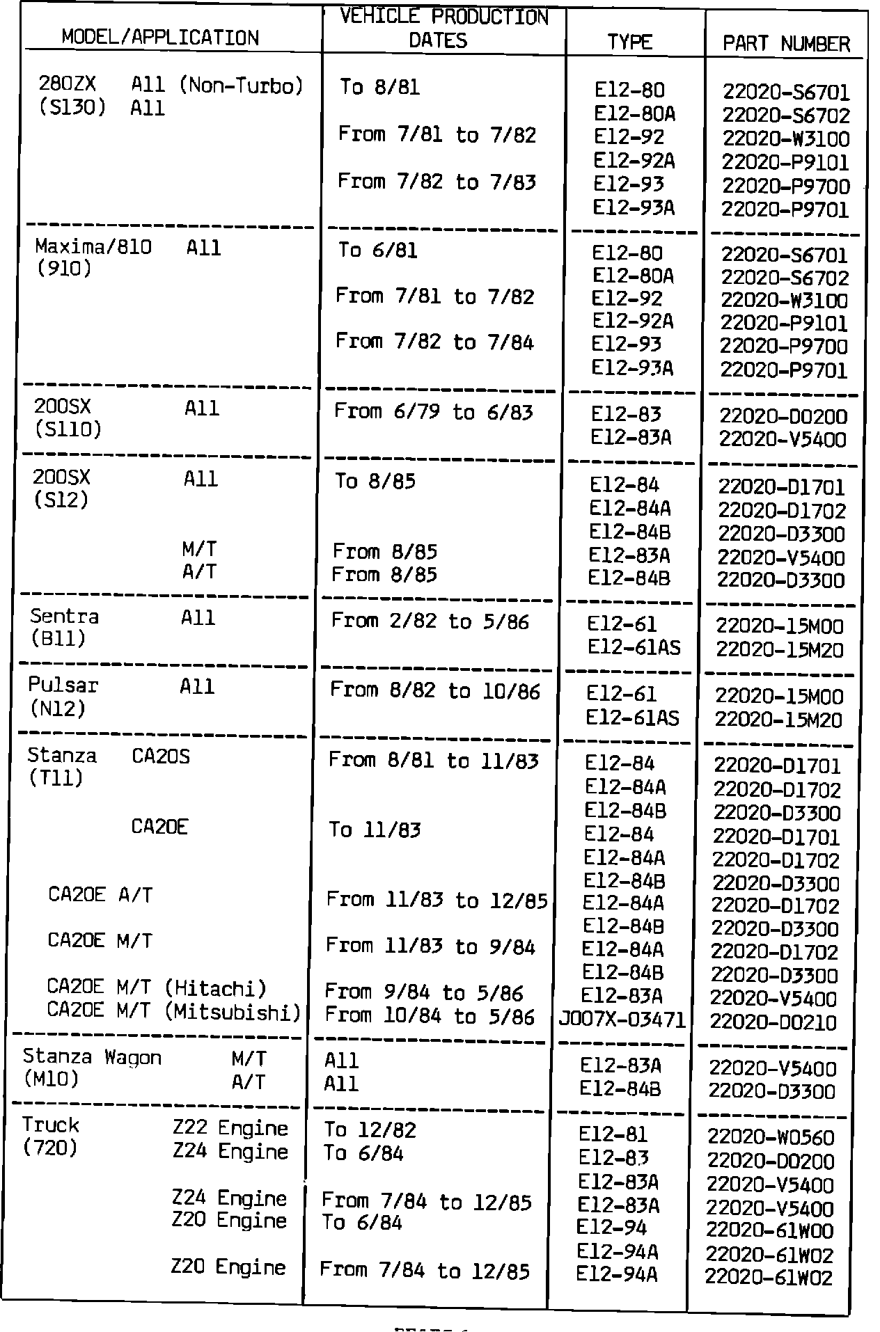 The chart on page 2/2 of this bulletin is a summary of the transistor ignition unit applications for some Nissan models. When replacing an ignition unit, refer to the chart to obtain and/or verify part numbers.