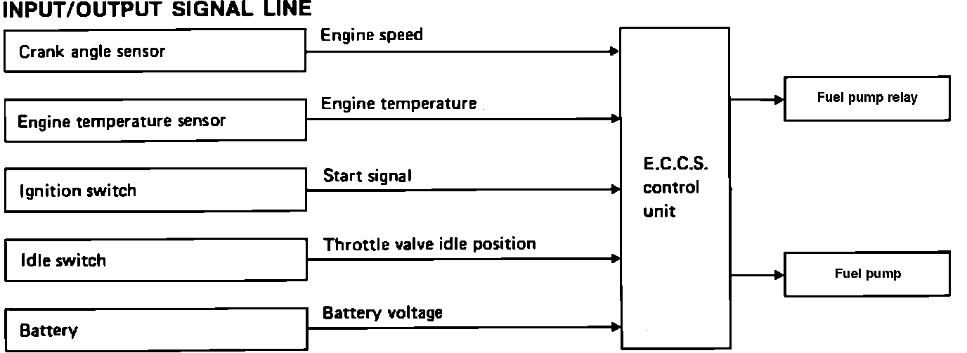 The ECU controls the voltage supplied to the fuel pump through a relay and through a separate circuit. The relay is only used in the "Back-Up Mode". Refer to BACK-UP SYSTEM for further description.