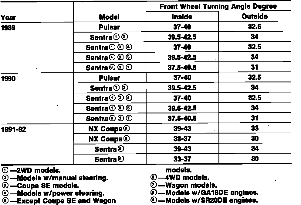 When a vehicle negotiates a turn, the inner wheel must turn at a sharper angle than the outer wheel, and the outer wheel must travel farther than the inner wheel. Vehicle steering geometry is calculated to allow for these variations, causing the outer wheel to toe-out by a calibrated amount. This toe-out on turns is also referred to as steering angle and on these models, is generally checked at two positions. The first position is at a reference point on the inner wheel travel while the second position of measurement is at full steering lock. To check steering angles, proceed as follows: