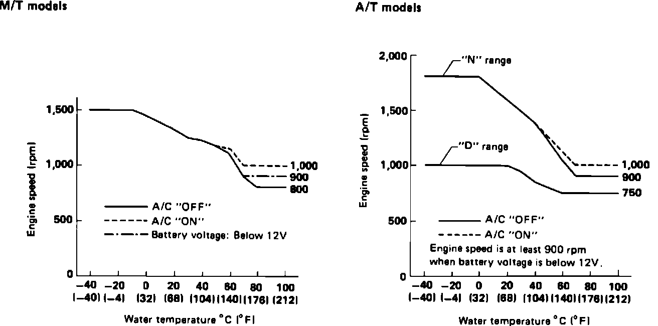 The idle speed is controlled by the amount of air that is allowed to bypass the throttle plate through the auxiliary air control (AC) valve. The AC valve is turned ON and OFF at a rate between 100 and 200 Hz. The ECU calculates the duty cycle (frequency of ON/OFF signals) necessary to maintain the proper idle speed, compensating for transmission gear position, electrical and accessory loads. In addition, the throttle body is equipped with an idle up solenoid and fast idle control device (FICD). They are activated by the ECU when the power steering load switch closes or an excessive electrical load is applied to the charging system, to allow an increased amount of air to bypass the throttle plate.