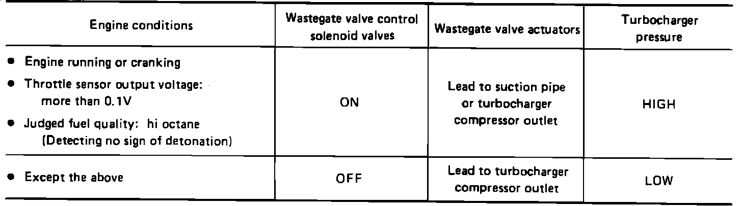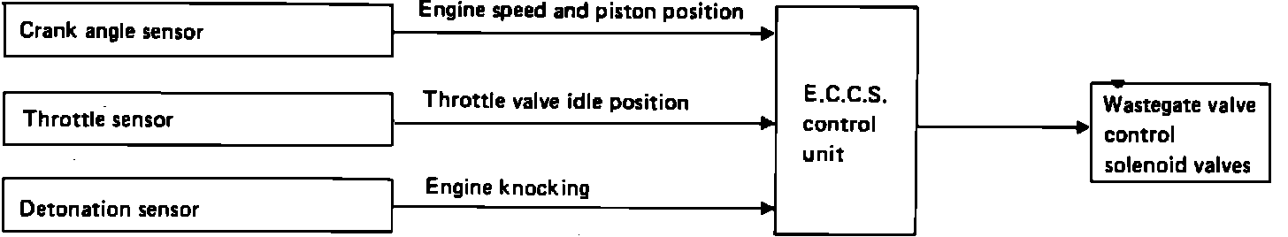 The ECU controls the amount of turbocharger boost via the wastegate valve and solenoid. The ECU monitors the engine speed and position, throttle position and for the presence of detonation to determine boost requirements.