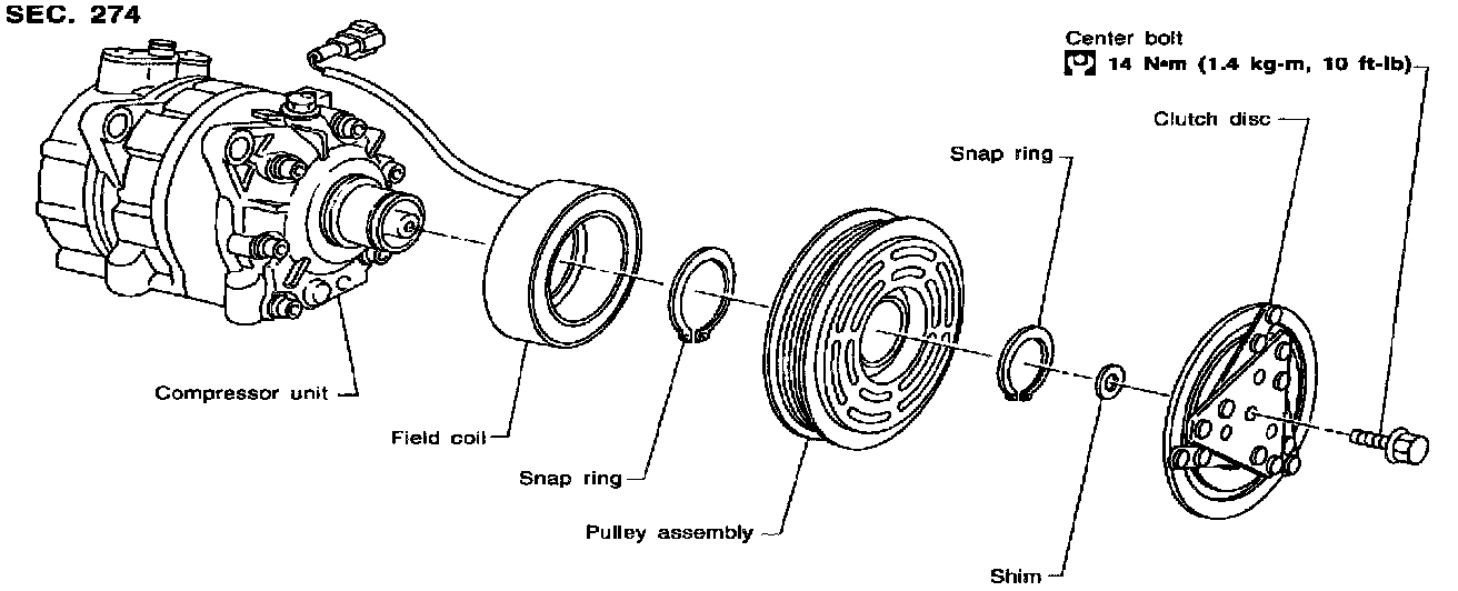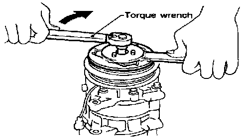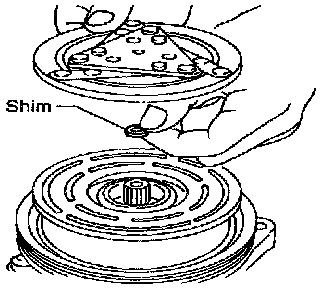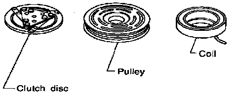 When replacing compressor clutch assembly, always carry out the break-in operation. This is done by engaging and disengaging the clutch about thirty times. Break-in operation raises the level of transmitted torque.