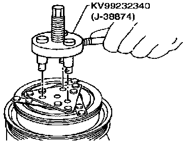 Insert the holder's three pins into the holes in the clutch disc. Rotate the holder clockwise to hook it onto the plate. Then, tighten the center bolt to remove the clutch disc.