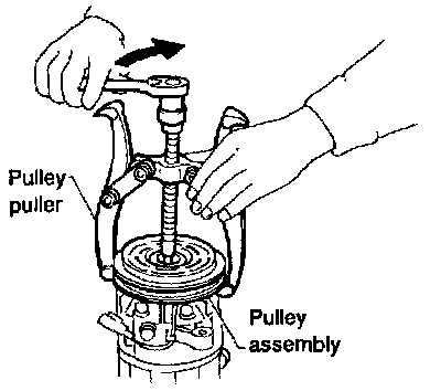 To prevent the pulley groove from being deformed, the puller claws should be positioned onto the edge of the pulley assembly.