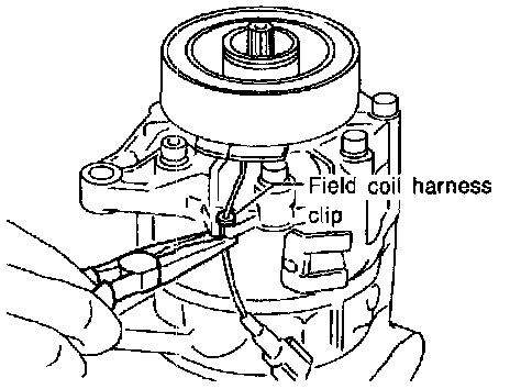 ^ Remove the field coil harness clip using a pair of pliers.