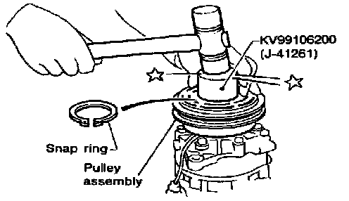 ^ Install the pulley assembly using the installer and a hand press, and then install the snap ring using snap ring pliers.