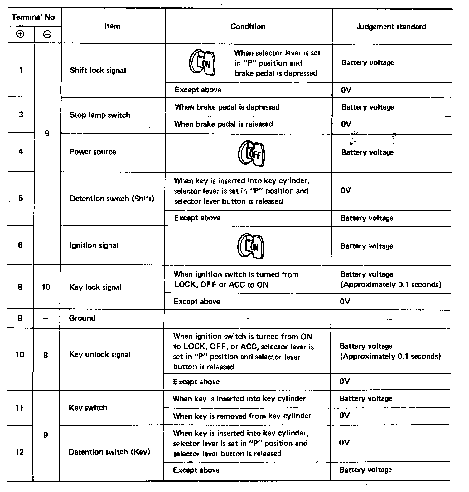 Shift Lock Control Unit Inspection Table (Data Are Reference Values):