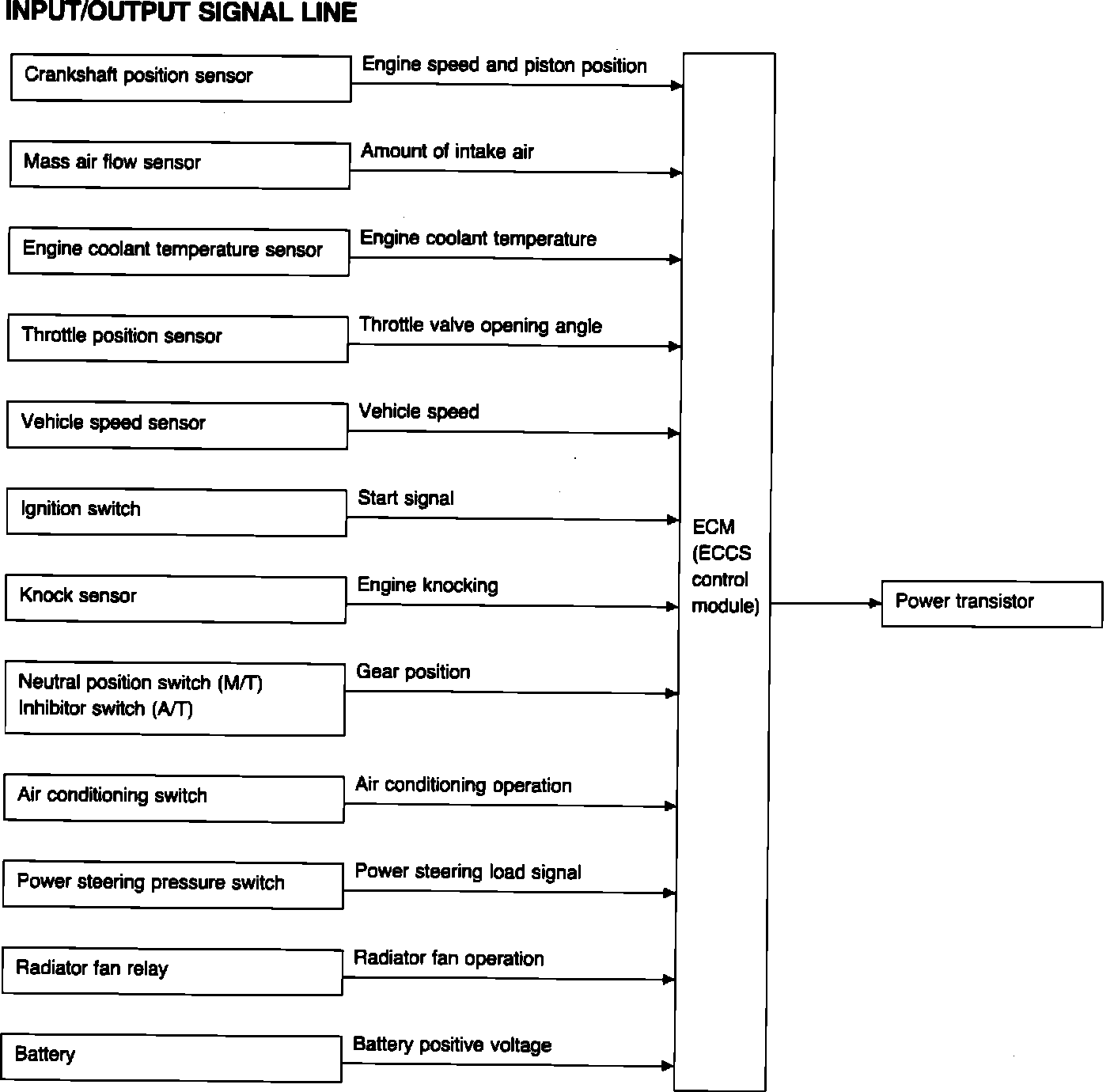 The power transistor (mounted on the air cleaner housing) is a voltage amplifier that allows the signal sent from the ECM to activate the primary circuit in the ignition coil. This induces high voltage in the secondary windings of the ignition coil, providing spark to the distributor cap and plugs.