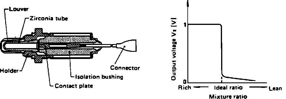 The differences in oxygen content between the exhaust gas and the atmosphere make the sensor generate a voltage signal. The zirconia generates voltage from approximately 1V in richer conditions to 0V in leaner conditions.