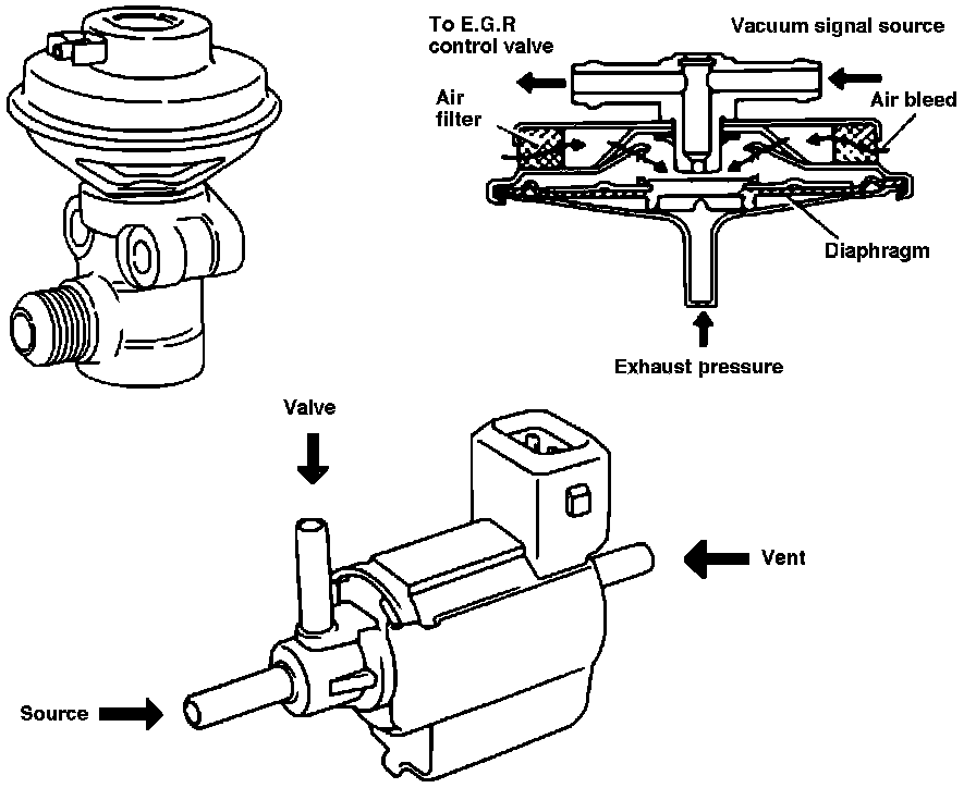 The EGR valve is controlled by the Engine Control Module (ECM) through the EGR solenoid and by exhaust back pressure acting on the Back-Pressure Transducer (BPT) Valve.