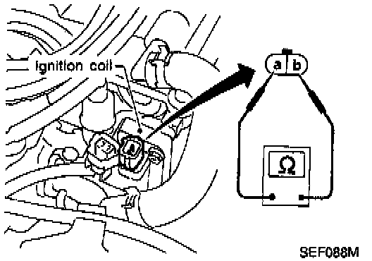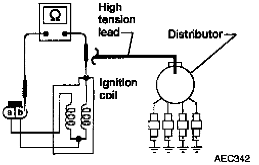 2. Check resistance between ignition coil harness connector terminal (b) and the connector on the ignition coil for the high tension lead.