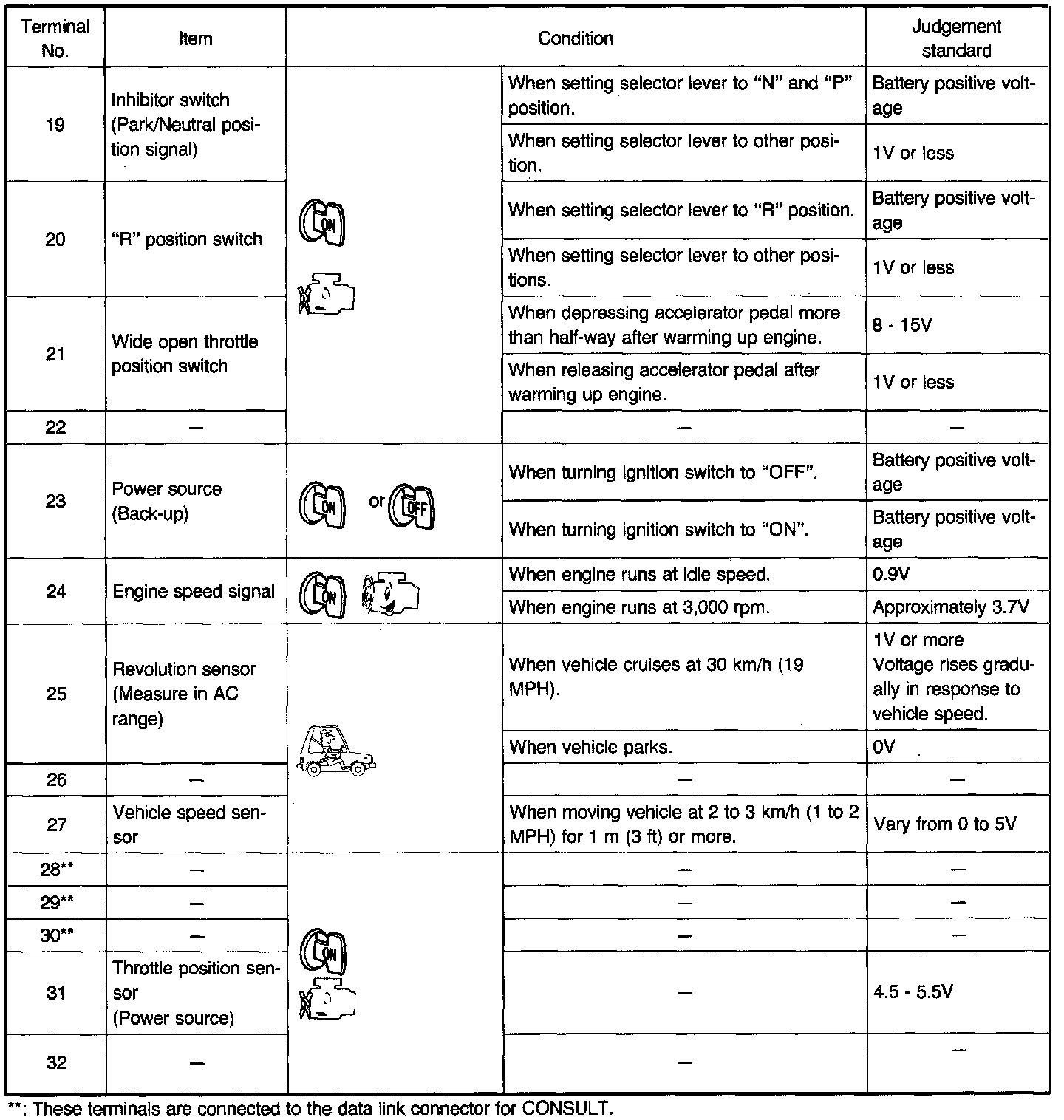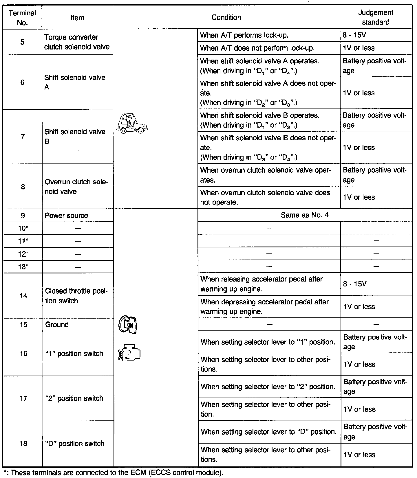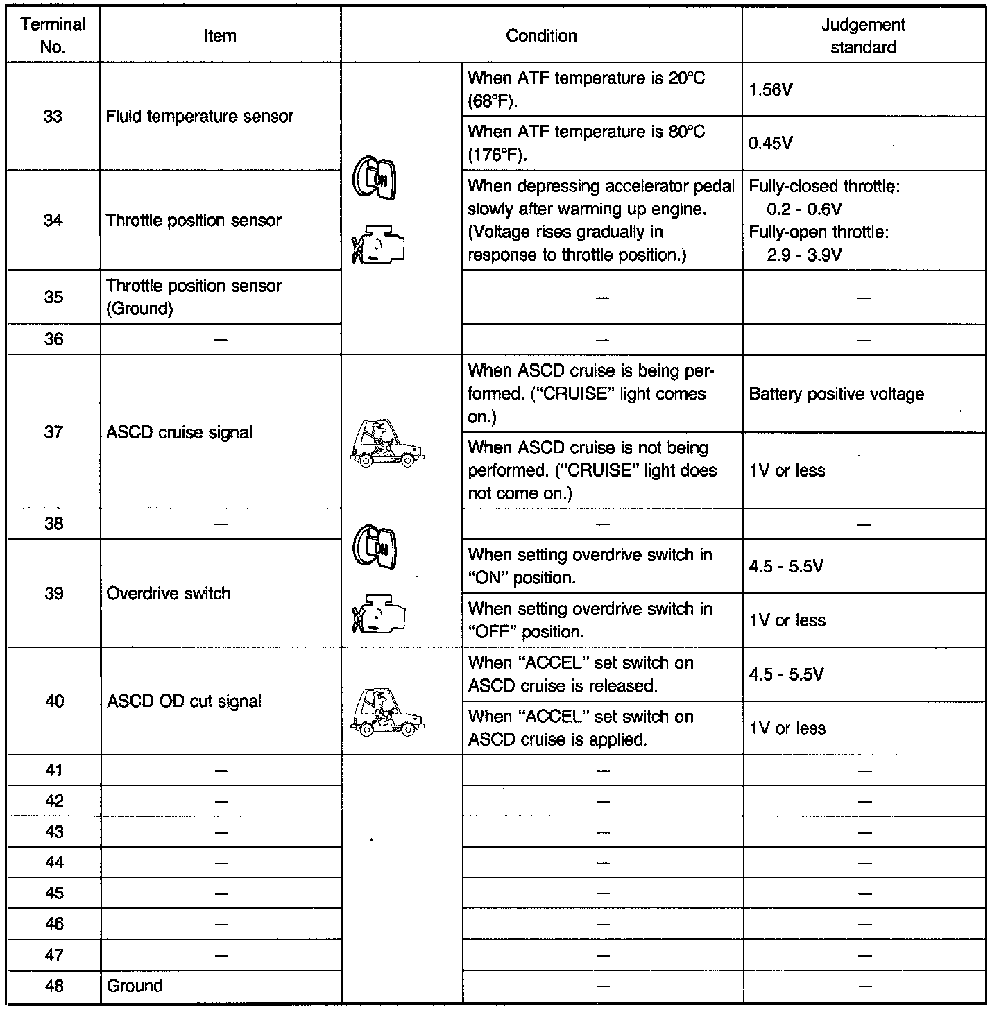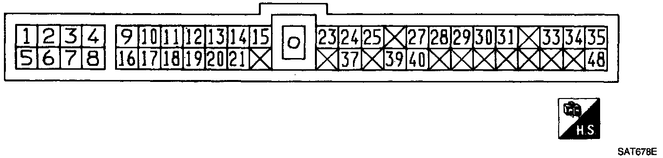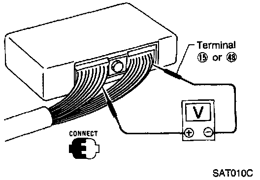 Measure voltage between each terminal and terminal (15) or (48) by following "A/T CONTROL UNIT INSPECTION TABLE".