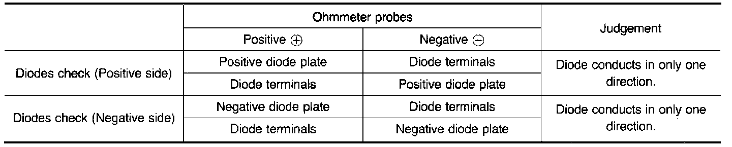 - Use an ohmmeter to check condition of diodes as indicated in chart above.