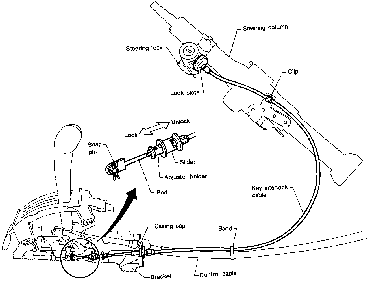 1. Remove snap pin temporarily and remove key interlock cable from vehicle.