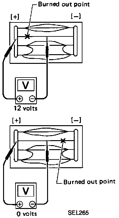 3. To locate burned out point, move probe to left and right along filament to determine point where tester needle swings abruptly.