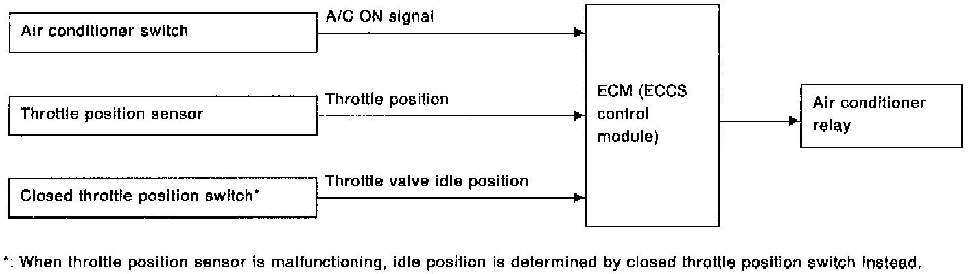 The acceleration cut control (ACC) system is used to improve engine operation by disengaging the A/C compressor when the throttle valve is at wide open throttle Wide Open Throttle (WOT).