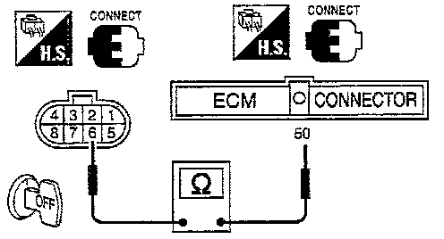 Check harness continuity between EGR temperature sensor sub-harness connector terminal (6) and ECM terminal (50).