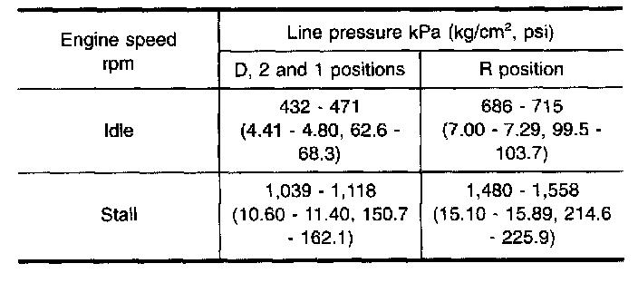 - Continue to depress brake pedal fully while line pressure test is being performed at stall speed.