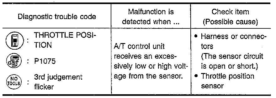 The throttle position sensor detects the throttle valve position and sends a signal to the A/T control unit.