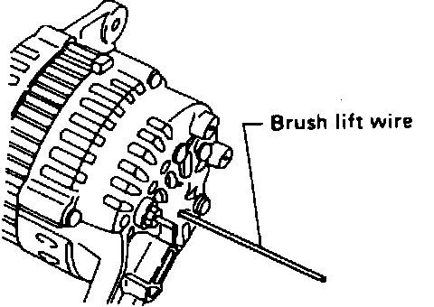 5. Reconnect two wire connectors, then insert a short stiff length of wire through the access hole at back of alternator until it contacts outer brush. Ground other end of wire to alternator case which will actually ground the F terminal internally, Fig. 3.