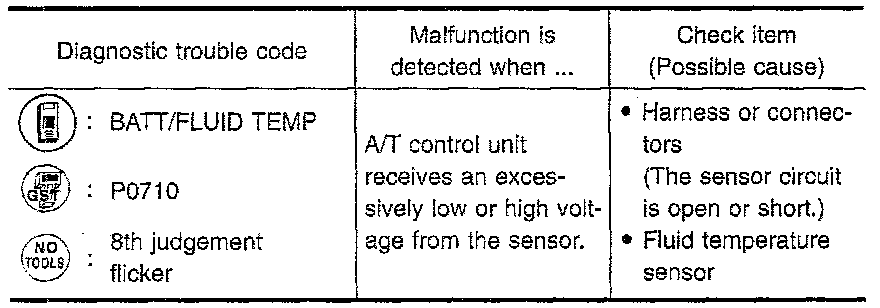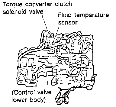 The fluid temperature sensor detects the ATF temperature and sends a signal to the A/T control unit.