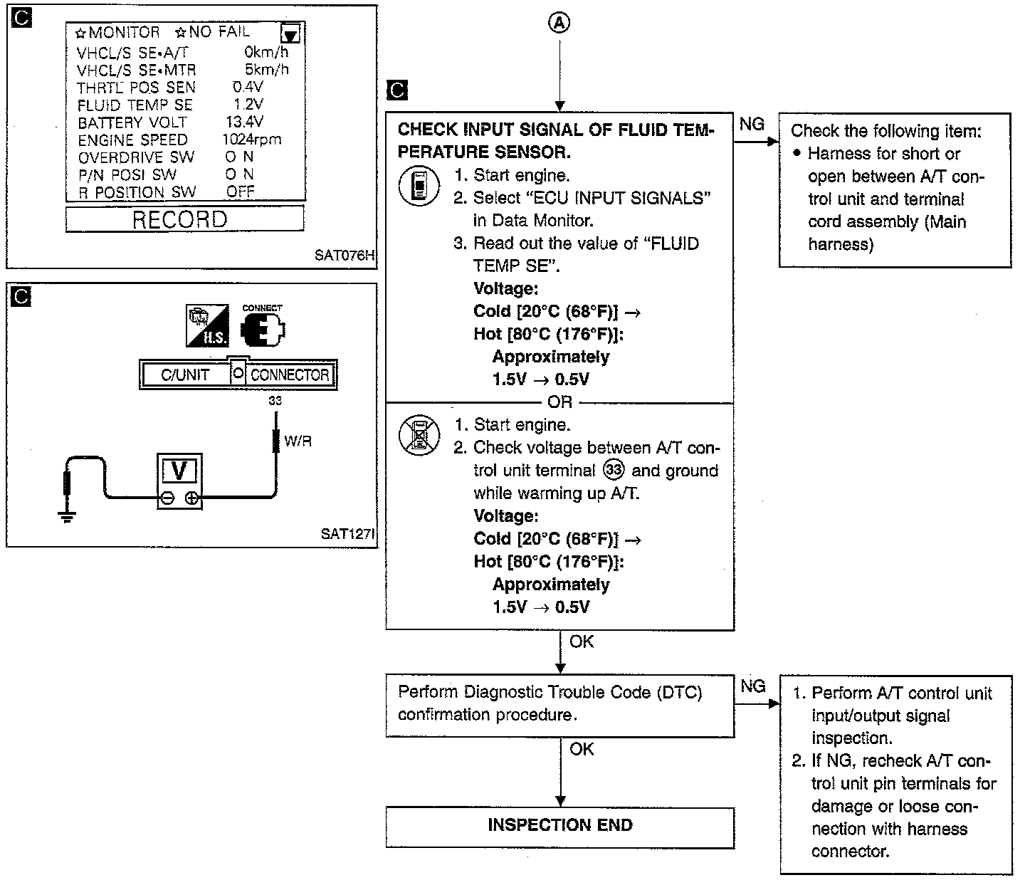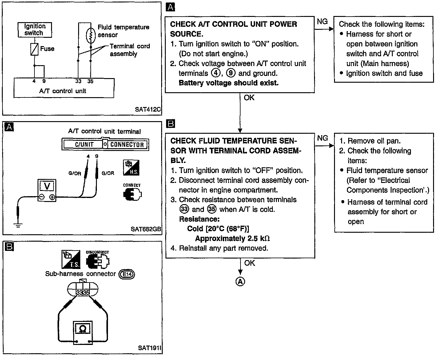 FLUID TEMPERATURE SENSOR CIRCUIT AND A/T CONTROL UNIT POWER SOURCE CIRCUIT CHECKSDescription