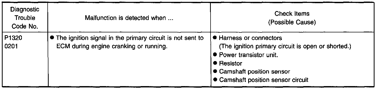 - If both DTC P0340 (0101) and P1320 (0201) are displayed, perform TROUBLE DIAGNOSIS FOR DTC P0340 first.
