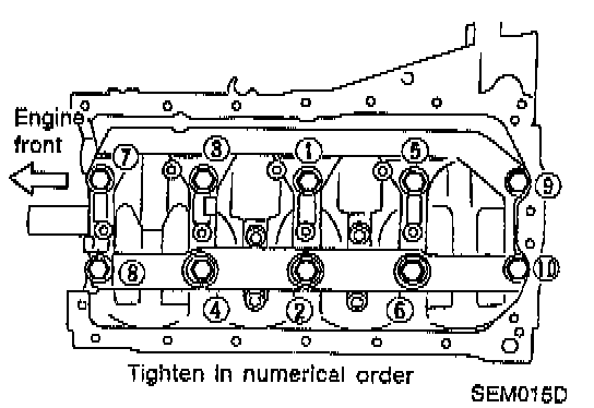1. Install crankshaft, main bearing caps and beam, then tighten bolts to the specified torque in the numbered sequence shown.