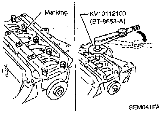 3. Turn all bolts 75 to 80 degrees clockwise with angle wrench tool No. KV10112100, or equivalent.