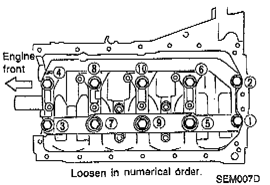 CAUTION: When loosening the bearing cap bolts, observe the loosening sequence shown. Loosen the bolts in 2 to 3 steps.