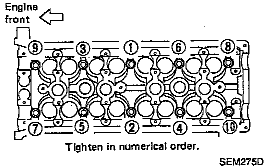 Tighten bearing cap bolts gradually in two or three steps. Start with center bearing and move outward as shown in figure.