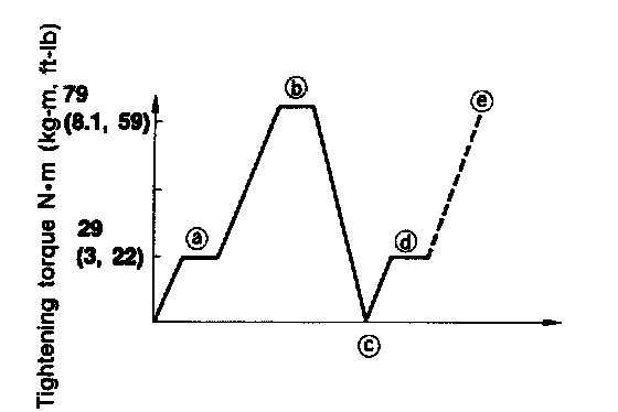e. Turn all bolts 86 to 91° clockwise. If an angle wrench is not available, mark all cylinder head bolts on the side facing the engine front. Then, turn each cylinder head bolt 86 - 91° clockwise.