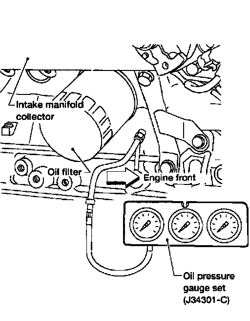 5. Check the oil pressure with the engine running under no-load. With the engine running at 3,000 RPM the approximate discharge pressure should be 412 - 481 kPa (60 - 70 psi) and at idle the pressure should be more than 78 kPa (11 psi). If the difference is extreme, check oil passage and oil pump for oil leaks.