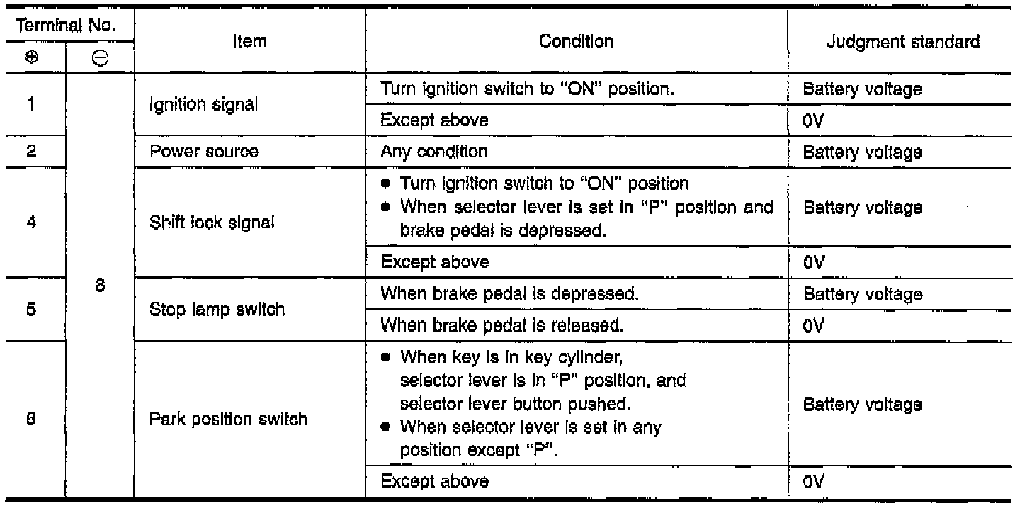 Shift Lock Control Unit Inspection Table:
