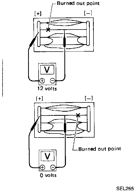 2. If a filament is burned out, circuit tester registers 0 or 12 Volts.