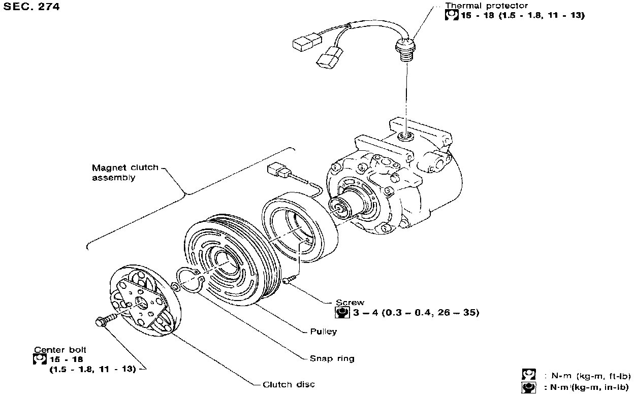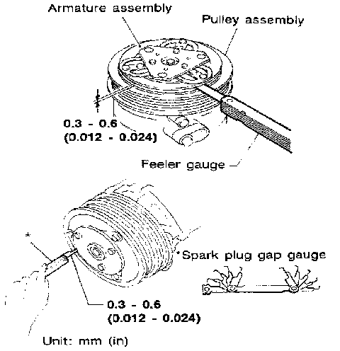 When replacing compressor clutch assembly, always conduct the break-in operation. This is done by engaging and disengaging the clutch about thirty times. Break-in operation raises the level of transmitted torque.