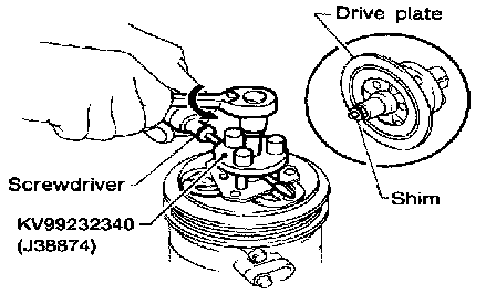 While tightening the center bolt, insert a round bar (screwdriver, etc.) between two of the pins (as shown in the image) to prevent drive plate rotation. After removing the drive plate, remove the shims from either the drive shaft or the drive plate.