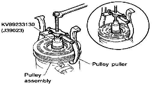 To prevent deformation of the pulley groove, the puller claws should be hooked under (not into) the pulley groove.