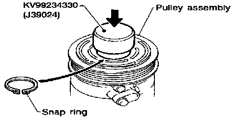 ^ Install the pulley assembly using the installer and a hand press, and then install the snap ring using snap ring pliers.