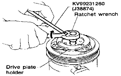 ^ Using the holder to prevent drive plate rotation, tighten the bolt to 12 to 15 NM (1.2 to 1.5 Kg-m, 9 to 11 ft-lb) torque.